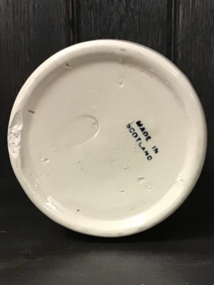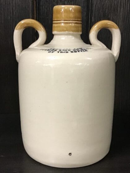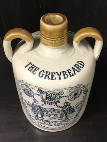 A brown two-tone glazed twin handle stoneware flagon from Mitchell Bros. Ltd., Glasgow, Scotland. "Heather Dew Blended Scotch Whisky The Greybeard". Bears black lettering. Made by Possil Pottery Glasgow and bears impressed mark and black backstamp to base.