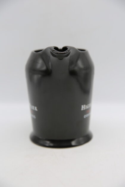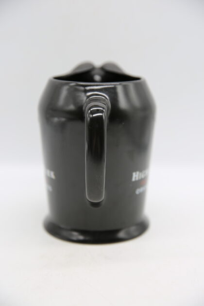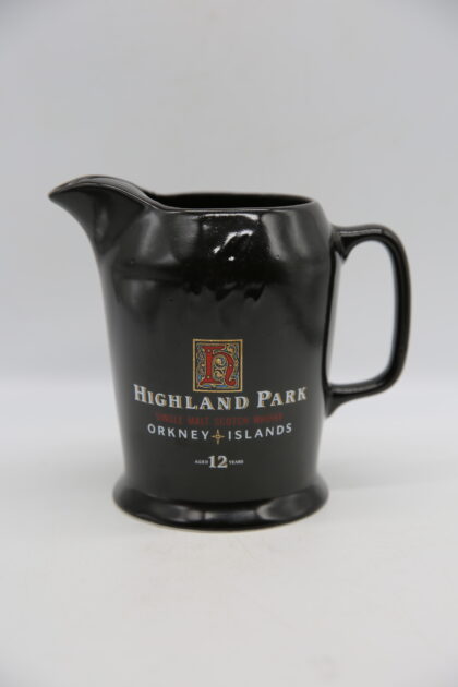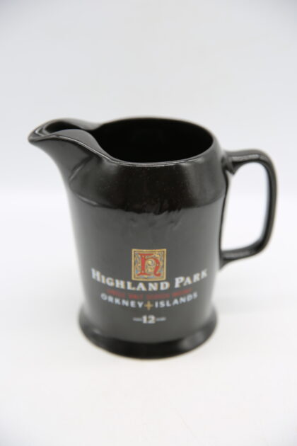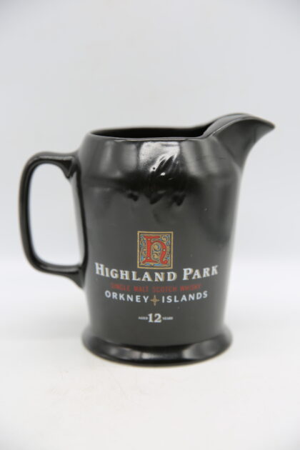 A black glazed ceramic bartop water jug. Bears white and red lettering which reads, "Highland Park Single Malt Scotch Whisky Orkney Islands Aged 12 Years". Made by Wade and bears red backstamp to base.