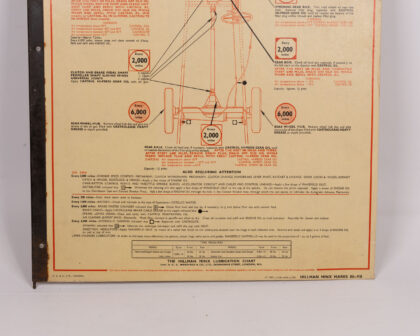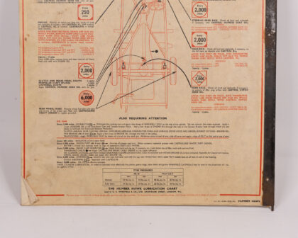 Vintage Hillman Minx and Humber Hawk Lubrication Charts. Double-sided, featuring detailed diagrams and maintenance instructions. Shows signs of age with some marks and wear, adding to its vintage appeal. An interesting piece for car enthusiasts or collectors of automotive memorabilia. Shows wear around edges and marks throughout. Would look great framed.