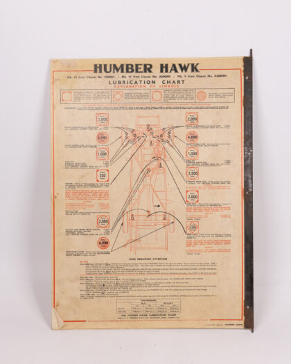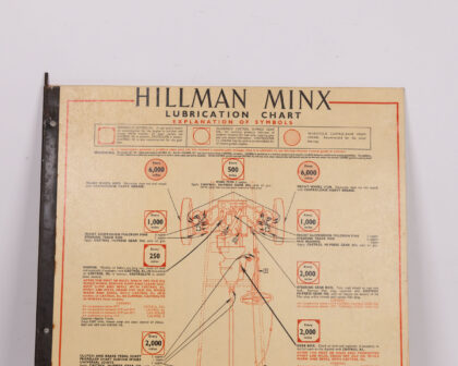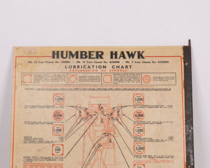 Vintage double-sided lubrication chart for Hillman Minx and Humber Hawk cars. Ideal for collectors or car enthusiasts.