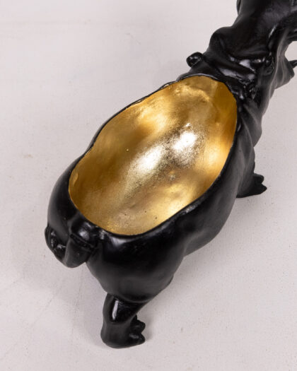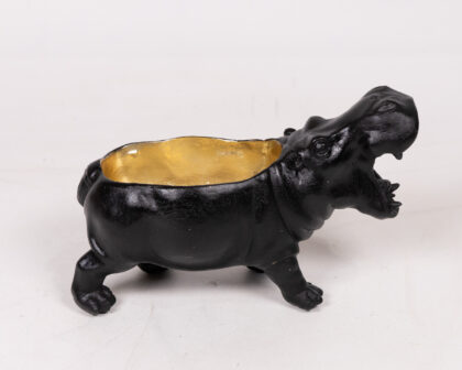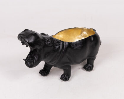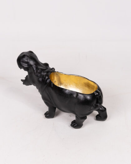 This striking hippo ornament doubles as a planter or dish, adding a touch of whimsy to your decor. The exterior is finished in matte black, while the interior boasts a contrasting gold colour. It's perfect for small plants or as a standalone decorative piece. Ideal for living rooms, bedrooms, or even as a quirky desk accessory.