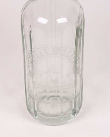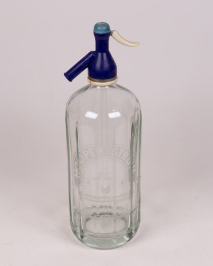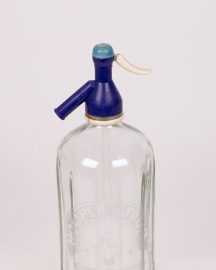 Vintage Hooper Struve & Co glass soda siphon. This unique bottle has a thick clear glass body, featuring the iconic 'Refreshing Now As 100 Years Ago' branding. The top has a classic blue and cream soda siphon mechanism, typical of vintage siphons. This soda siphon is a nostalgic nod to a bygone era, making it a great addition to any collection or as a decorative piece.
