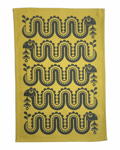 This Hornsea Nessie tea towel in a lovely chartreuse colour. Featuring a playful Nessie (Loch Ness Monster) design in black, this tea towel adds a touch of whimsy to your kitchen decor. Made from 100% cotton, it is both absorbent and durable, making it perfect for everyday use. A delightful and practical addition to any home, this tea towel is sure to bring a smile to your face every time you use it.