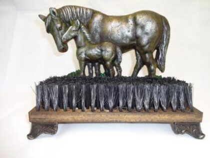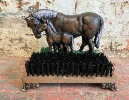 This beautiful cast iron doorstop features both a useful boot brush and a horse decoration. Perfect for placing outside a farmhouse back door, this doorstop will not only keep your door open, but will also stop mud from being dragged indoors! The item is finished in stunning bronze effect. The eye-catching decoration features a mare carefully looking after her young foal. The doorstop is made from cast iron while the brush base has a wooden construction.