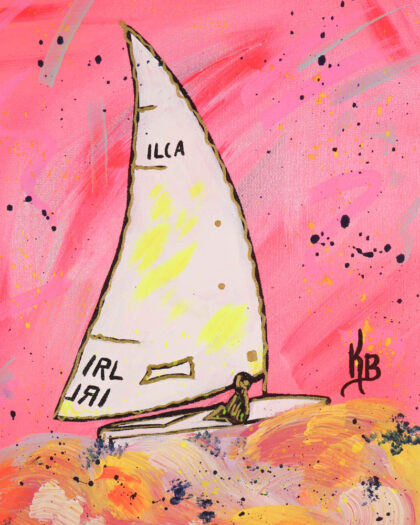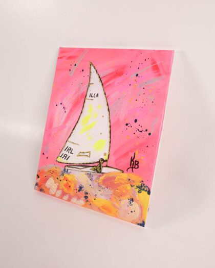 This is a brand new contemporary sailboat painting on canvas by Irish artist Kate Broderick. The painting features a sailboat with a white sail outlined in yellow and black, labelled 'ILCA' and 'IRL'. The sailboat is sailing on waves of orange and blue, set against a vibrant pink background with accents of light grey and black paint splatters. The painting is initialled 'KB' by the artist. The dimensions are approximately height 36 cm & width 28cm. This painting would look well displayed in a living room or bedroom, adding a pop of colour and a touch of nautical charm.