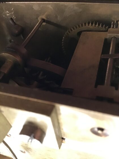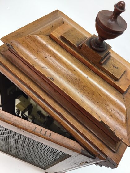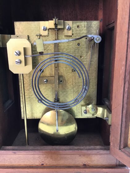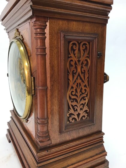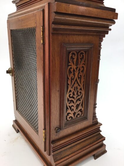 Working, ticking happily, chiming diligently; this is a high quality mechanism seated within a light-hardwood case with intricate fretwork to side panels, clean face, and complete workings including winder.