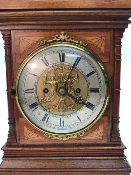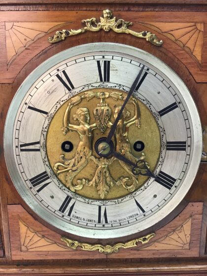 Circa 1840 by renowned London makers. Howel and James were clockmakers to Queen Victoria. This bracket clock would be late Victorian or Early Edwardian. Beautiful wood inlayed marquetry and a nice neoclassical brass center clockface with further brass decorative work.