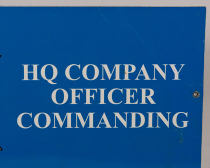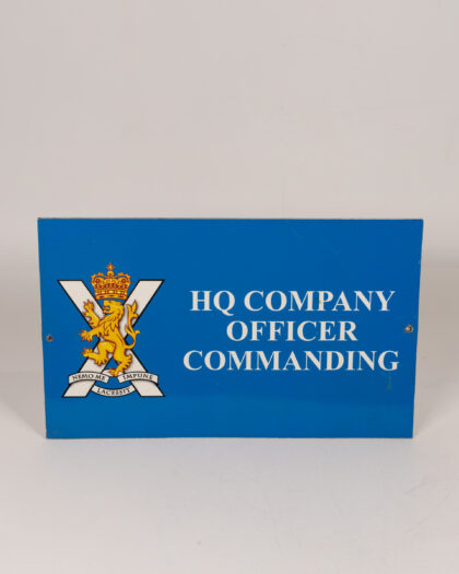 Vintage HQ Company Officer Commanding sign. Features a blue background with white lettering and a lion rampant crest. The sign reads "HQ Company Officer Commanding". Likely used to designate the headquarters of a military company. Shows some wear consistent with age and use. A unique piece of military memorabilia.