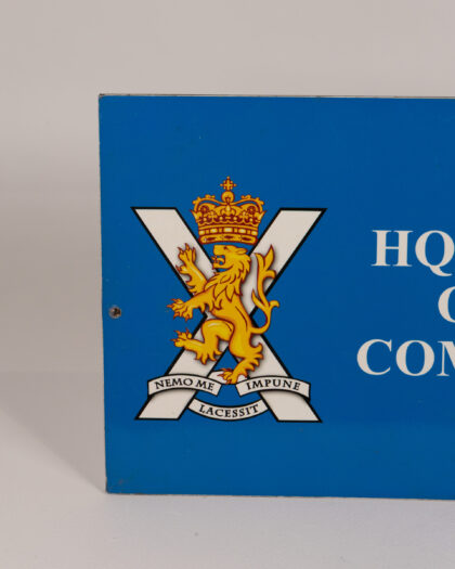 Vintage HQ Company Officer Commanding sign. Blue with white lettering and lion rampant crest. Military memorabilia. Good condition.