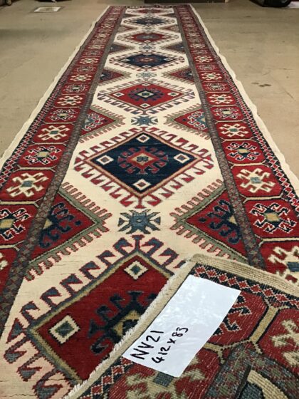 A huge 9m long runner. Cream ground, handwoven Caucasian runner with natural dyes and diamond medallion design.