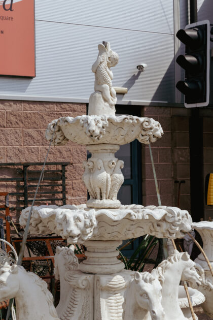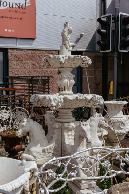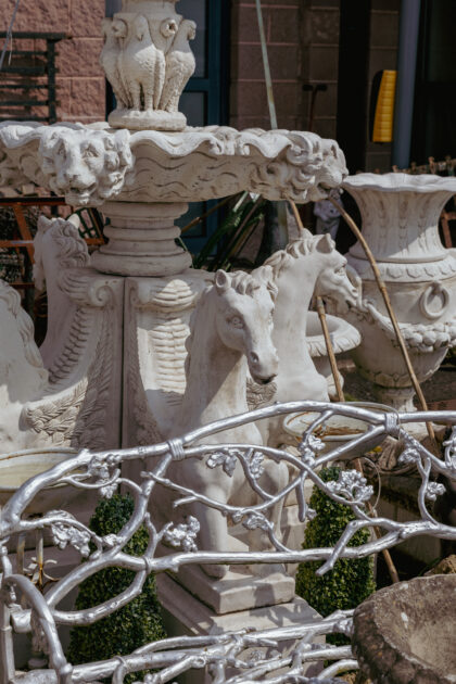 A very large Portuguese stone garden fountain with cherubs and horses adorning it.