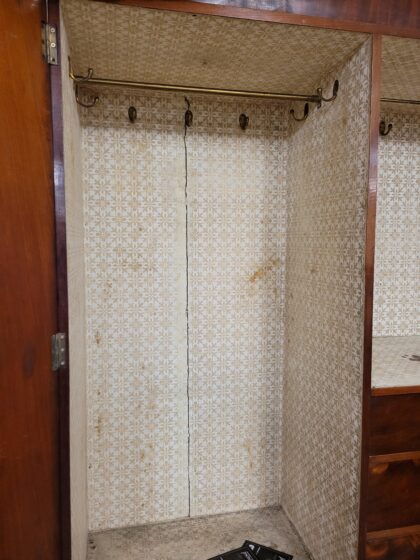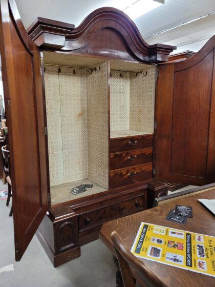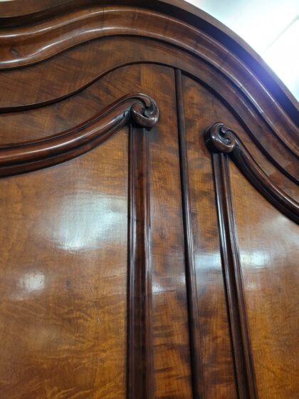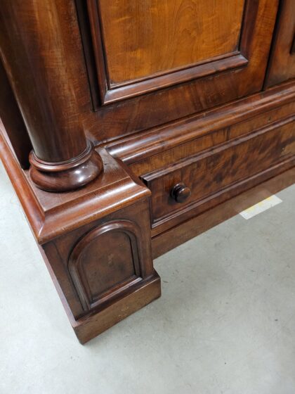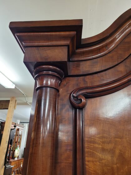 A statement piece for the bedroom! This huge Victorian armoire / wardrobe is of the highest quality. A stunning piece with French lines and classical columns that turn and open with the door. Crafted from Mahogany with fantastic flame mahogany panels. Circa 1860.