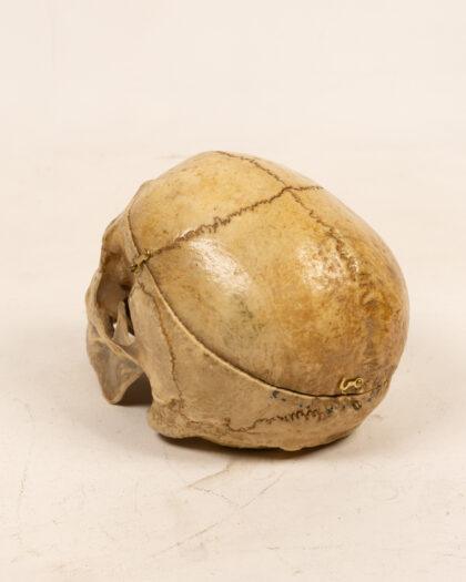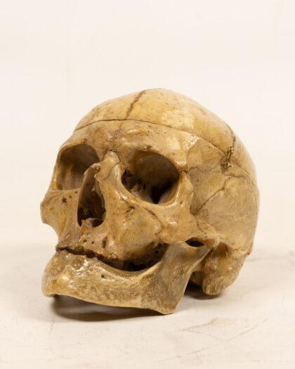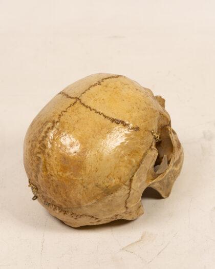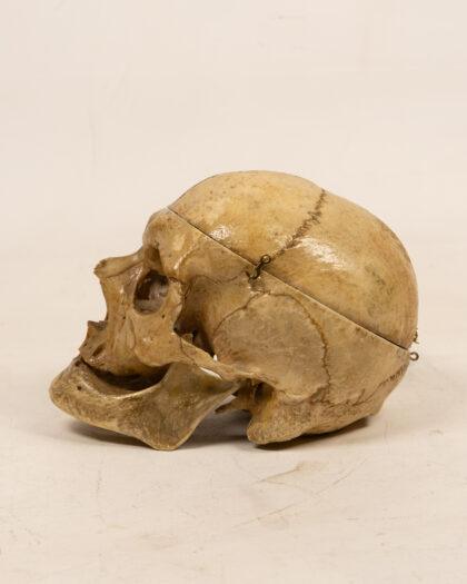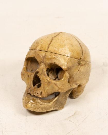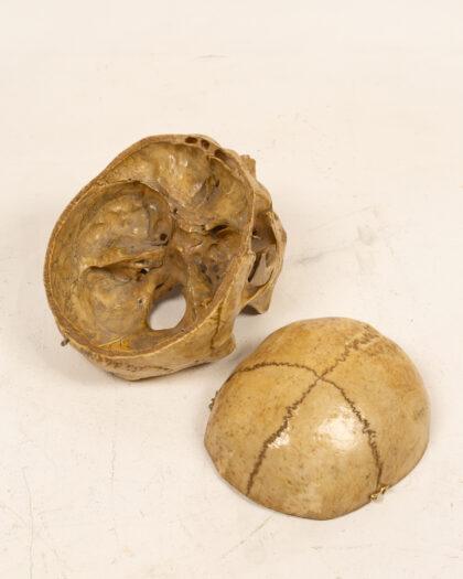 This is a human skull featuring a hinged calvarium, allowing for interior examination. Ideal for medical students, educators, or collectors seeking unique anatomical display pieces. The skull shows detailed bone structure with visible sutures, nasal cavity, eye sockets, and teeth. Hinged calvarium for internal view.