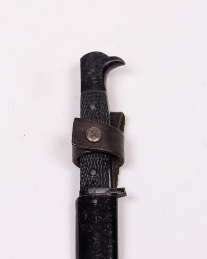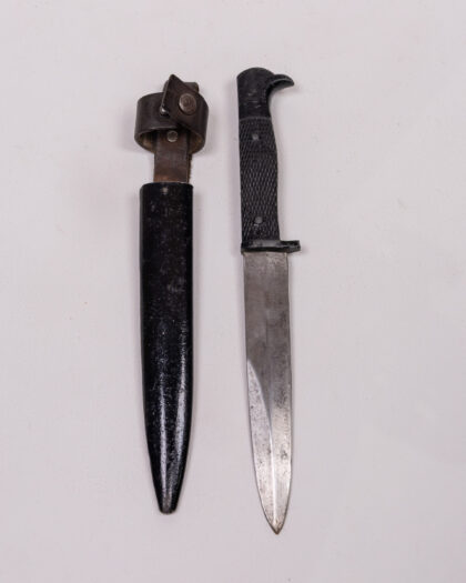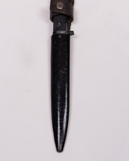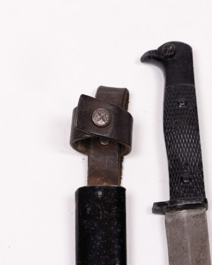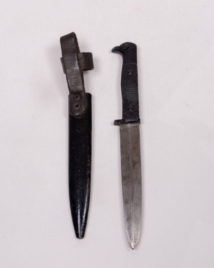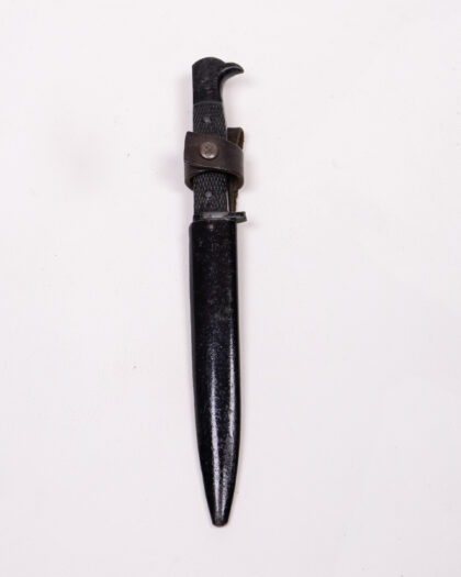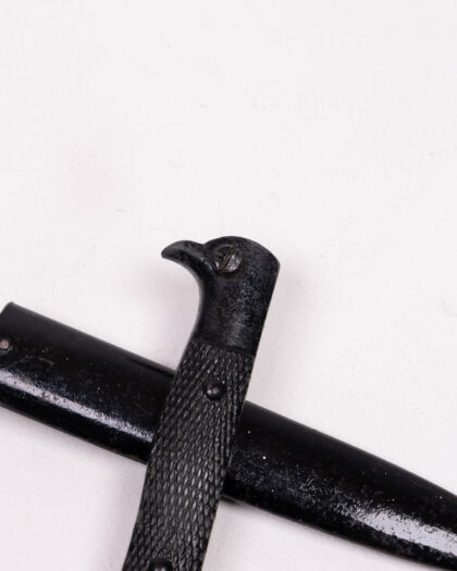 Imperial German Bayonet / fighting Knife WW1. This is a military knife, crafted from steel with a black plastic handle and a metal sheath with leather strap. The knife shows signs of use commensurate with age. The sheath has a leather strap and metal clasp. The knife has a 'bird's head' pommel. The item would make a fine display piece or addition to a military collection. The sheath shows some scuffs and wear but remains in good condition overall. Blade show some age-related blemishes.