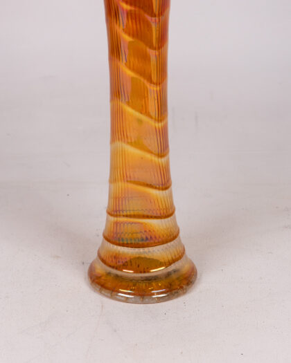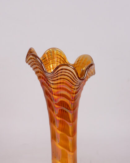 Beautiful vintage Imperial Carnival Glass vase featuring a striking iridescent finish. The glass showcases a vibrant orange hue with gold undertones, creating a mesmerizing shimmer. The vase has a slender neck and a ruffled, decorative rim, adding to its elegance. The base is sturdy and subtly ribbed. This piece would make a stunning addition to any glassware collection or as a standalone decorative item. In excellent vintage condition, with no visible chips or cracks. A true statement piece!