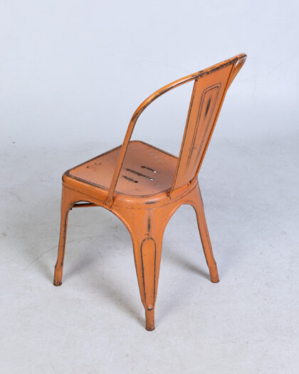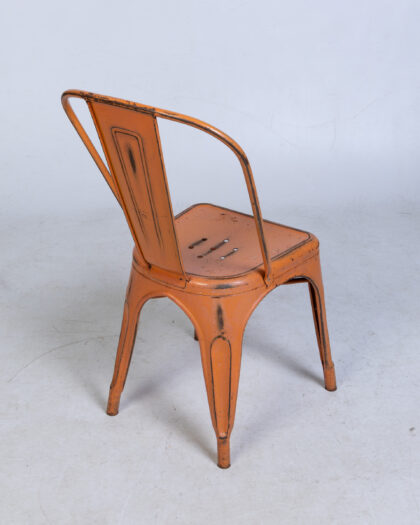 Orange metal industrial chair with distressed finish. Sturdy construction, perfect for adding character to any space. Industrial style.
