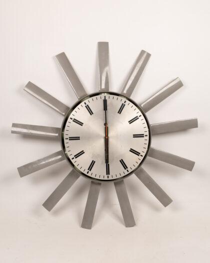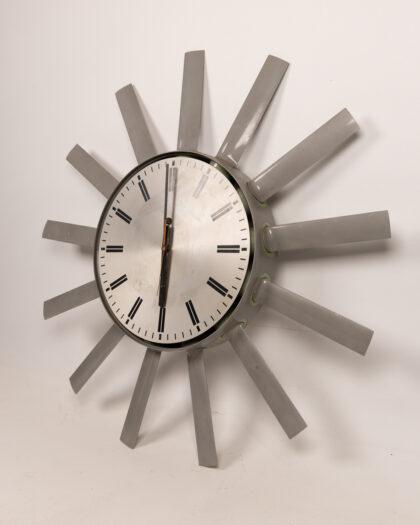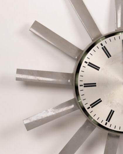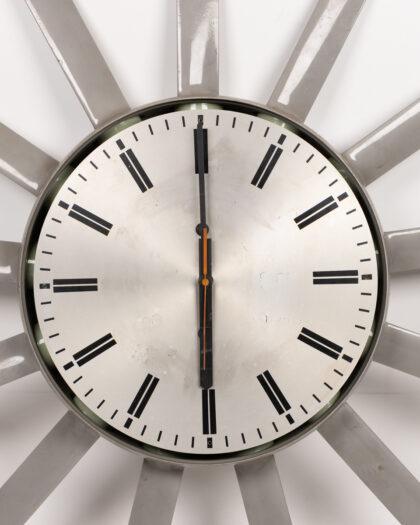 This industrial sunburst wall clock features a sleek metal design with bold hands and clear numeral markers. It is a unique clock that came from a military base and could be made from a jet engine. It is heavy for the size!