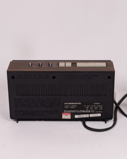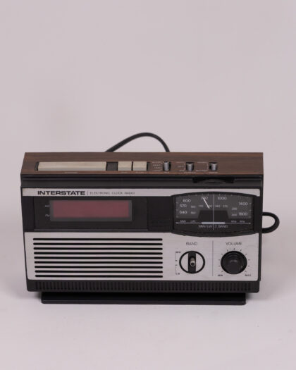 This is an Interstate electronic clock radio. It features an AM/PM digital display, snooze and fast/slow settings, alarm options and a radio with MW/LW band. The radio has a volume control. It has a brown wood effect top and a silver effect speaker grill. There is some minor wear and tear to the plastic.