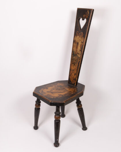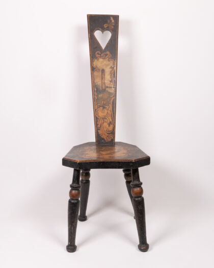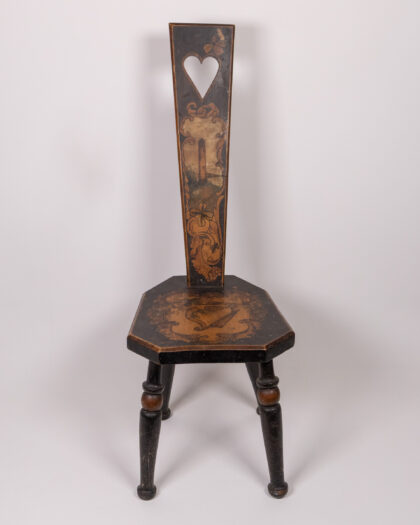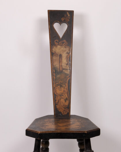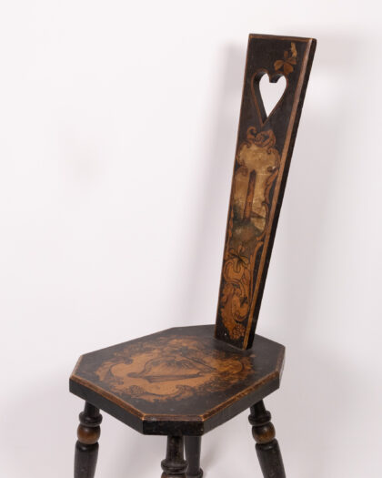 Unique vintage hand-painted Irish wooden chair featuring a heart cut-out design. Showing signs of age adding to its character.