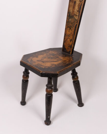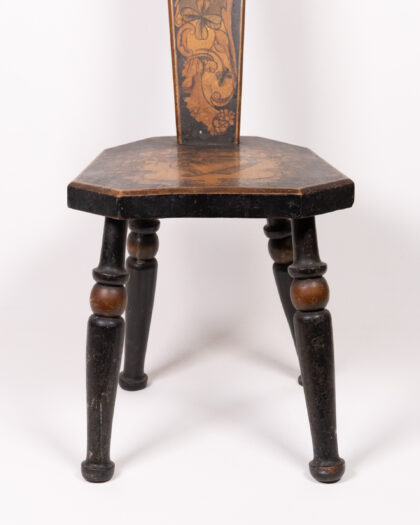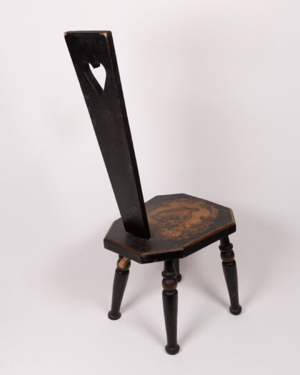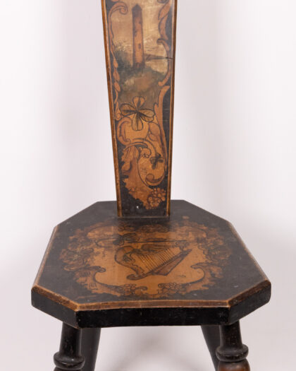 This charming vintage spinning Wheel chair is crafted from wood and hand-painted with a unique design possibly Devenish Iseland in Co Fermanagh. The chair features a cut-out heart shape in the backrest. The seat is octagonal with an image of a harp. The paint is distressed due to age. There are signs of wear, but this adds to its character. This is a decorative and unusual chair.