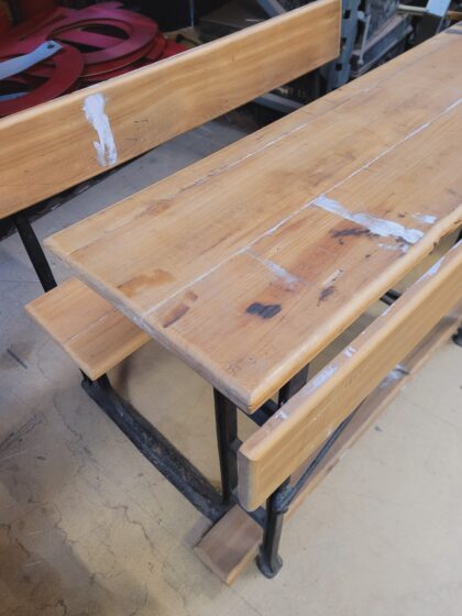 This vintage school desk features a sturdy iron frame and wooden seats, perfect for adding character to any space. Ideal for a study area, children's playroom, or as a unique decorative piece.