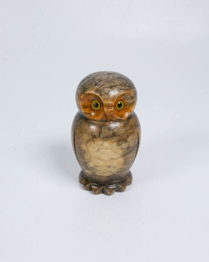 Hand-carved alabaster owl figurine with mottled brown and cream colouring. Features yellow glass eyes. Excellent condition. Made in Italy.