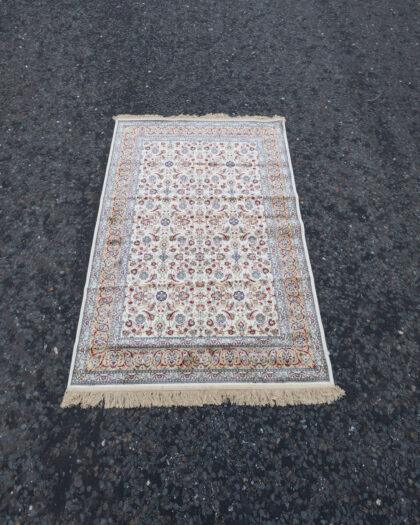 This exquisite cashmere rug features an intricate all-over floral pattern set against an ivory background, complemented by a unique gold border. Measuring 170cm x 118cm, it brings a touch of luxury and timeless elegance to any space.