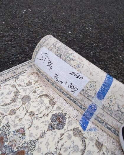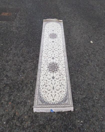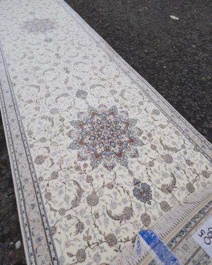 This exquisite Iranian runner rug features a fine woven ivory ground with an embossed floral pattern. Its intricate design adds elegance and sophistication to any space. Perfect for hallways or as a centrepiece in your home decor.