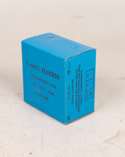 Vintage box for J. and G. Harris 12 Gauge cartridges. 25 cartridges, 2 1/2" 65mm, high-grade smokeless powder, crimp closure. Collectible condition.