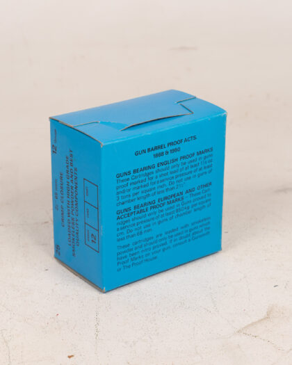 A box of J. and G. Harris (Fieldsports) Ltd. 12 Gauge cartridges. The box would have contained 25 cartridges, each 2 1/2" 65mm, loaded with high-grade smokeless powder. Features include crimp closure and quality components. The box has the original TEL number printed on it, 0738-71302, and states 32 grams. There are English and European proof marks and states Guns bearing English proof marks should only be used in guns proof marked for a shot load. The vintage box is in good condition, adding to its collectible value. A rare find for shooting enthusiasts or collectors of vintage ammunition packaging.