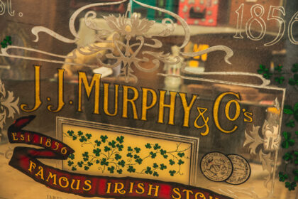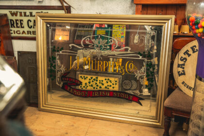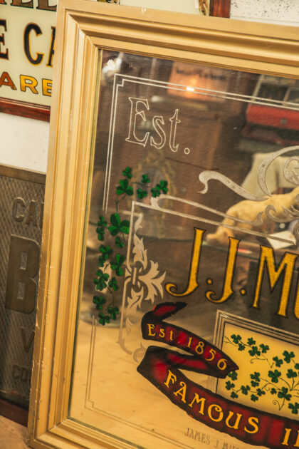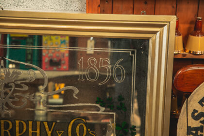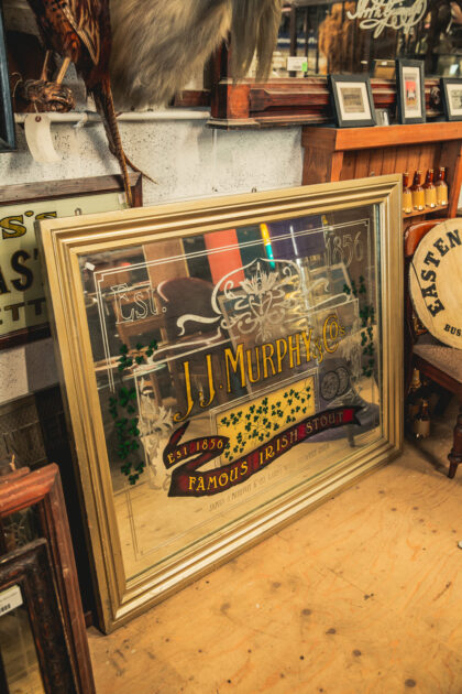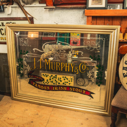 A large advertising mirror for J. J. Murphy & Co's Famous Irish Stout. Features etching and gilding.