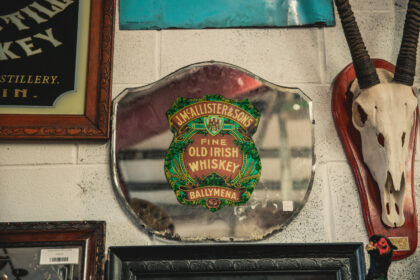 An advertising mirror in a clip frame bearing lettering which reads, "J. McAllister & Son's Fine Old Irish Whiskey Ballymena".