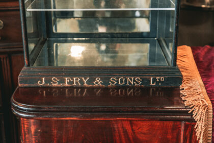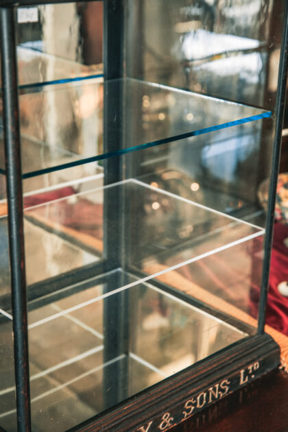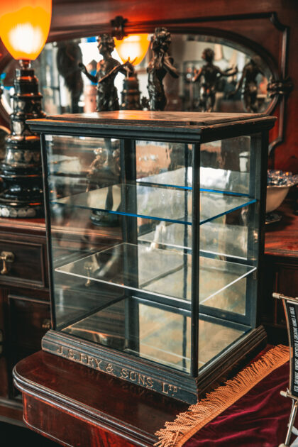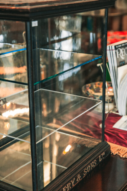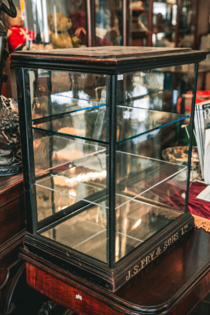 A glazed display cabinet for J. S. Fry & Sons Ltd. Chocolate and Biscuit Makers. Features a mirrored base and back door as well as two glass shelves.