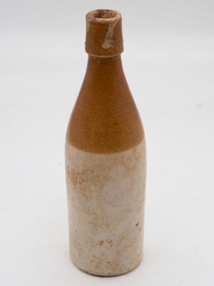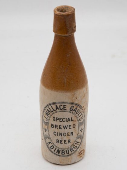 A Victorian, two tone brown glazed stoneware bottle for J. Wallace Gaults Edinburgh Special Brewed Ginger Beer. Bears a makers mark to the front and a small chip to the lip.