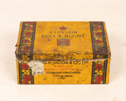 Vintage Jacob & Co's Marie Biscuits tin with floral design. Fair condition, aged patina. A collectible piece of Irish biscuit history.