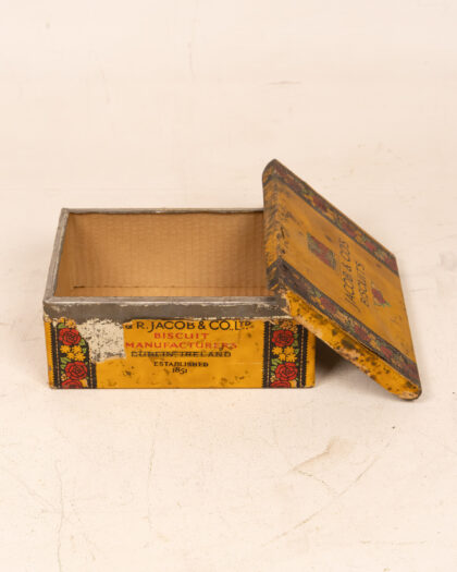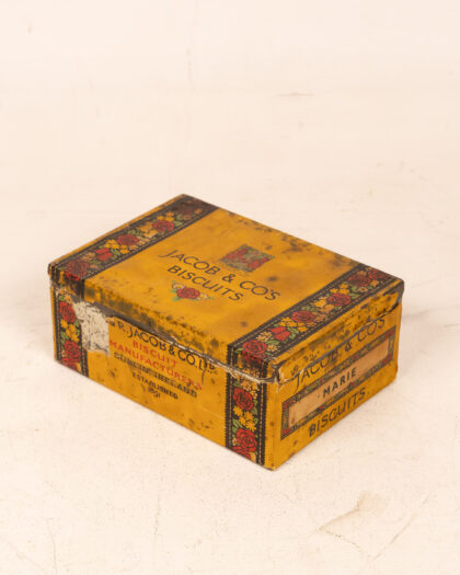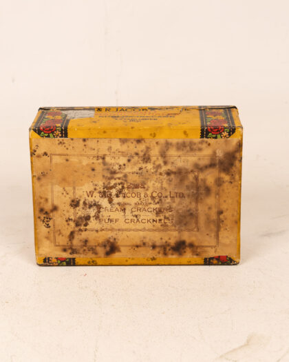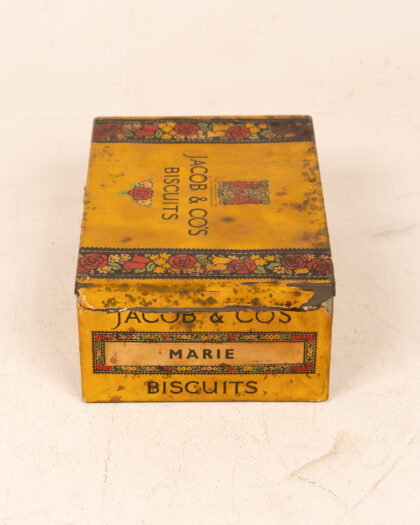 This is a vintage Jacob & Co's Marie Biscuits tin. The tin features a yellow background with floral designs along the edges. The top of the tin has the Jacob & Co's Biscuits logo. The tin shows signs of age and wear, including scratches, dents, and some rust. The tin is rectangular in shape and has a hinged lid. The inside of the tin is cardboard. The tin is a great piece of memorabilia for collectors of vintage biscuit tins. The tin is in fair condition, with some wear and tear consistent with its age.