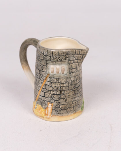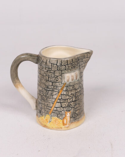 This vintage James Herriot's Country Kitchen jug features a charming farmyard scene. One side depicts a horse peering from its stable, the other shows a cat and broom next to hay bales. Perfect for collectors or adding a touch of rustic charm to your kitchen. In very good condition.