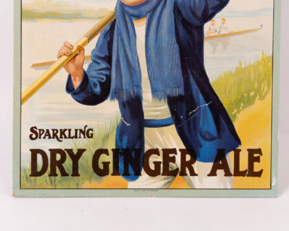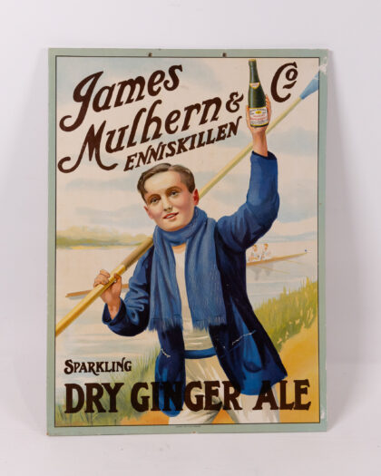 Vintage James Mulhern & Co. Enniskillen advertising sign for Sparkling Dry Ginger Ale. Features a young oarsman. Perfect for Breweriana collectors!