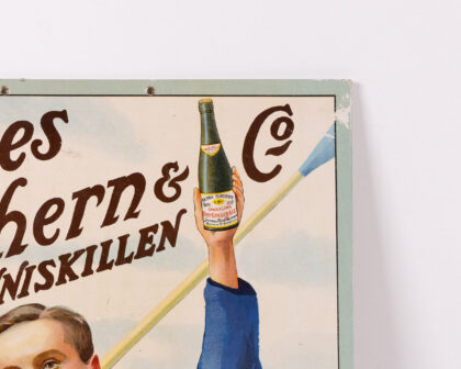 An original early 1900s antique advertising sign for James Mulhern & Co. Enniskillen Sparkling Dry Ginger Ale. The sign features a young man in rowing attire, holding a bottle of ginger ale and an oar. The artwork evokes a sense of nostalgia and the brand's connection to refreshment and leisure. The sign has a pale green border. Perfect for Breweriana collectors.