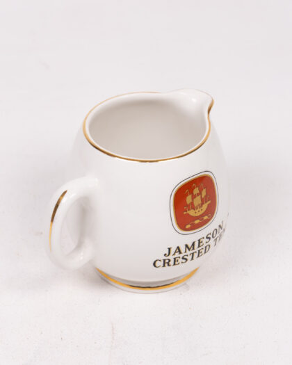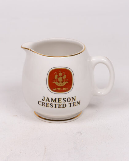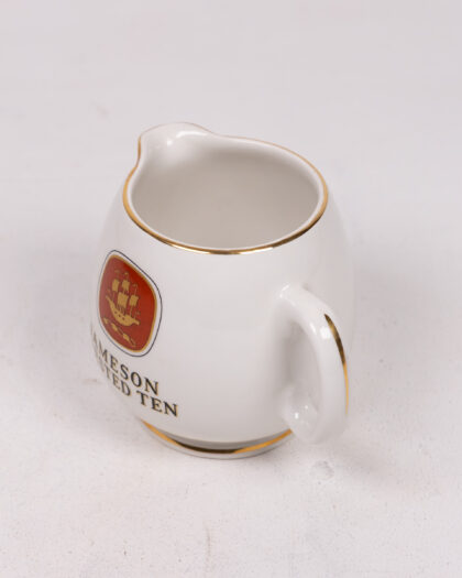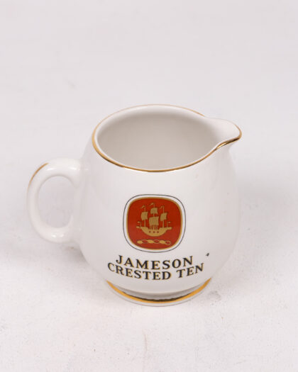 A vintage Jameson Crested Ten milk jug. This jug is ceramic and predominantly white, and has a gold trim around the rim and base. The Jameson Crested Ten logo is in the center of the jug, red and gold. The base has 'Produced in Arklow, Republic of Ireland' printed on it. This creamer jug is in very good condition, with minimal signs of wear. A collectible item with a unique design.