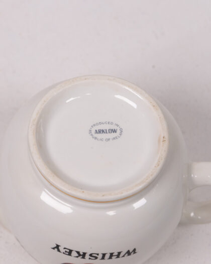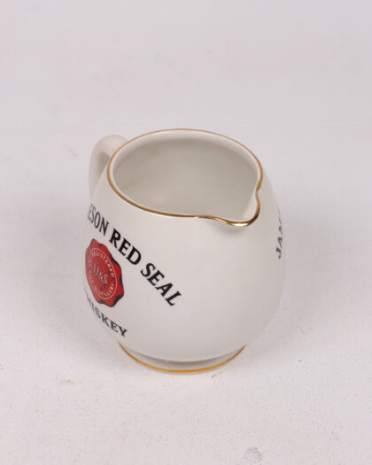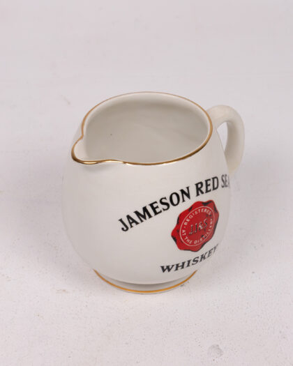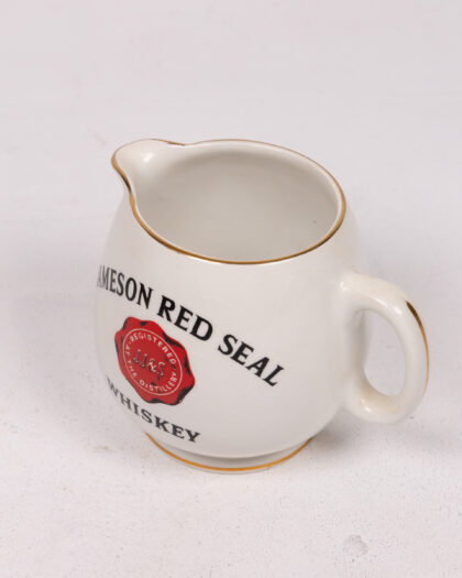 This is a vintage Jameson Red Seal Whiskey promotional jug. The jug is made from white ceramic with a gold trim around the rim and base. The front of the jug features the Jameson logo in black and red. The base is stamped with "Produced in Republic of Ireland - Arklow". It is in good condition. A wonderful addition to a home bar, or a gift for a Jameson collector.