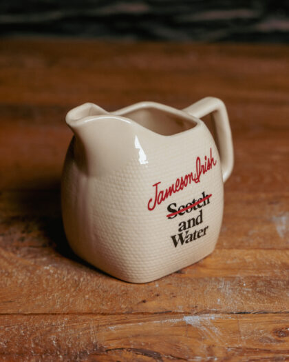 A white glazed ceramic jug for Jameson Irish Whiskey. Made by Calvert Distillers Co. and bears black backstamp to base. This jug was only produced for the American market.