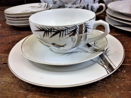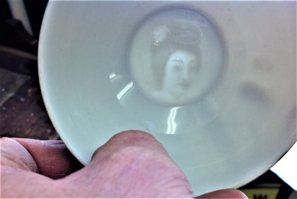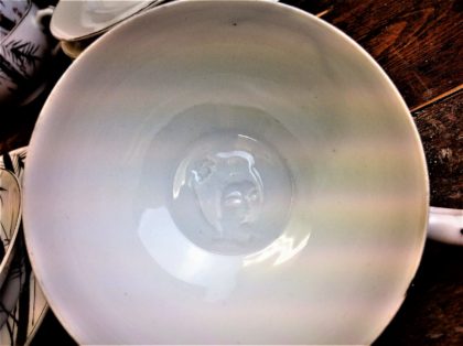 Geisha lithophane pocelain cups were first created in the Kutani region of Japan in the late 1800’s, and production continued until the 1950’s. The porcelain is thin and the spooky image at the bottom of the cup is created using a varying thickness of porcelain.
