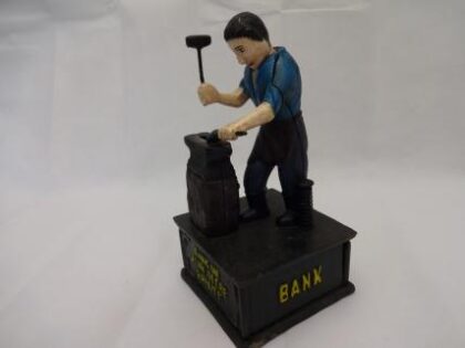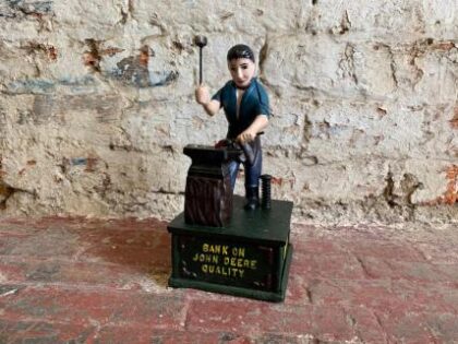 Here is a cast iron articulated moneybox featuring the slogan "Bank On John Deere Quality". This moneybox celebrates the famous American machinery manufacturer, John Deere, which was founded in 1837. The moneybox depicts a workman using his hammer and anvil. You can make him swing his hammer by pressing the spring near his foot. This is a lovely item for fans of the John Deere brand or of agricultural memorabilia in general. Perfect to use not only as moneybox, but also as an impressive ornament in its own right.