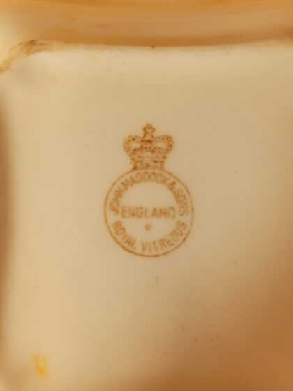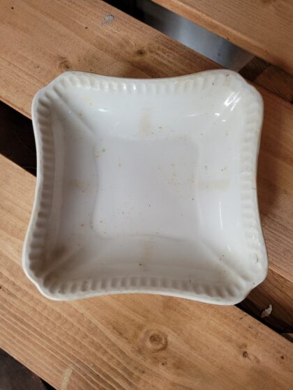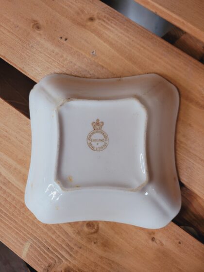 A white glazed ceramic ashtray. Made by John Maddock & Sons England Royal Vitreous and bears brown backstamp to base.