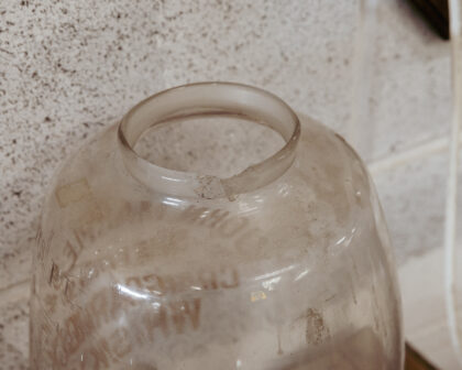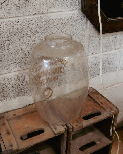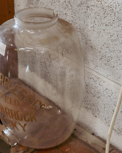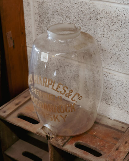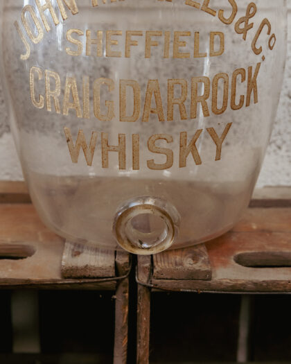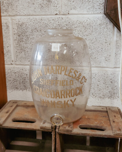 A large glass decanter with hand etched and gilded lettering reading, "John Marples & Co. Sheffield Craigdarrock Whisky". Features hand etched volume marker up one side. This is missing it's lid and tap. There is a large chip to the rim.