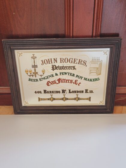 A framed advertising mirror. Bears lettering which reads, "John Rogers, Pewterers Beer Engine & Pewter Pot Makers Gas Fitters & c 440. Barking Rd. London E.13.".