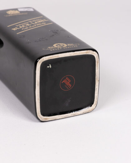 Vintage Johnnie Walker Black Label ceramic water jug/pitcher. Features the iconic Black Label logo in gold lettering on a sleek black background. The base is marked with 'Wade pdm England'. Ideal for collectors of breweriana or Johnnie Walker memorabilia. Perfect for a home bar or as a decorative piece.