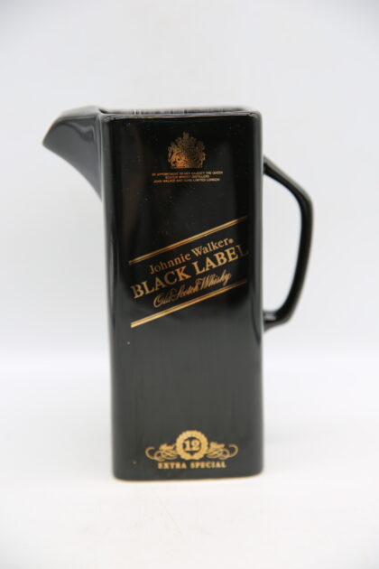 A black glazed ceramic bartop water jug. Bears gilt lettering which reads, "Johnnie Walker Black Label Old Scotch Whisky 12 Extra Special By appointment to Her Majesty the Queen Scotch Whisky Distillers John Walker and Sons Limited London". Made by Wade and bears red backstamp to base.