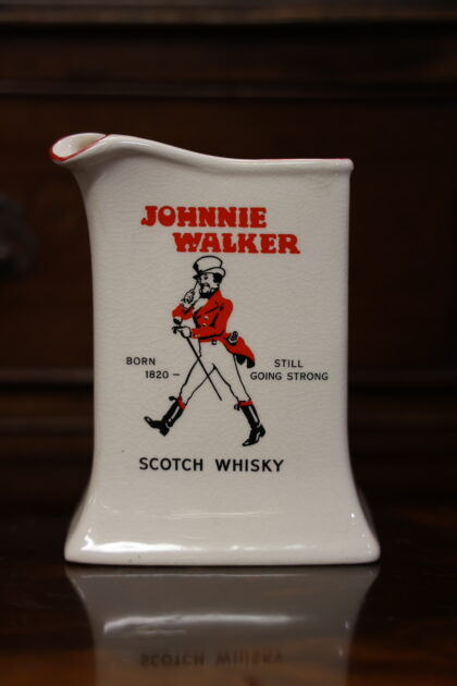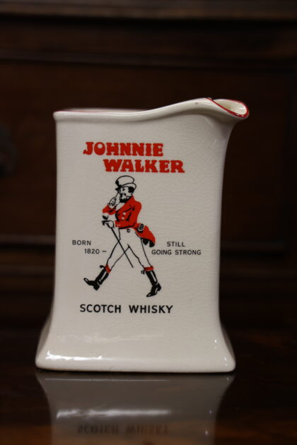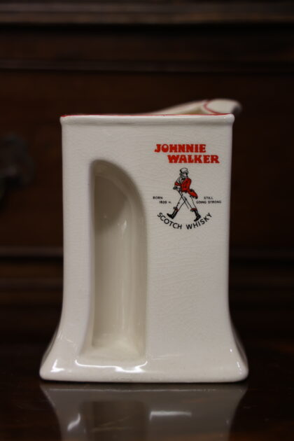 A white ceramic bartop water jug bearing red and black lettering which reads, "Johnnie Walker Scotch Whisky Born 1820- Still Going Strong". Made by Wade and bears black backstamp to base. There is a small crack on one of the faces.